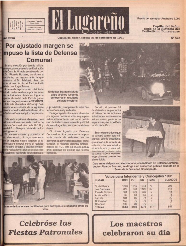El pasado miércoles, 8 de septiembre, se cumplieron 30 años desde el día en que el pueblo de Exaltación de la Cruz “eligió apoyar al hombre que cambiaría la historia para siempre”. Así lo definen desde Defensa Comunal, partido que representó aquel día Ricardo Bozzani, candidato a intendente que ganaría las elecciones con 21 votos de diferencia, y daría el puntapié inicial de una larga historia que aún se continúa escribiendo en el distrito.